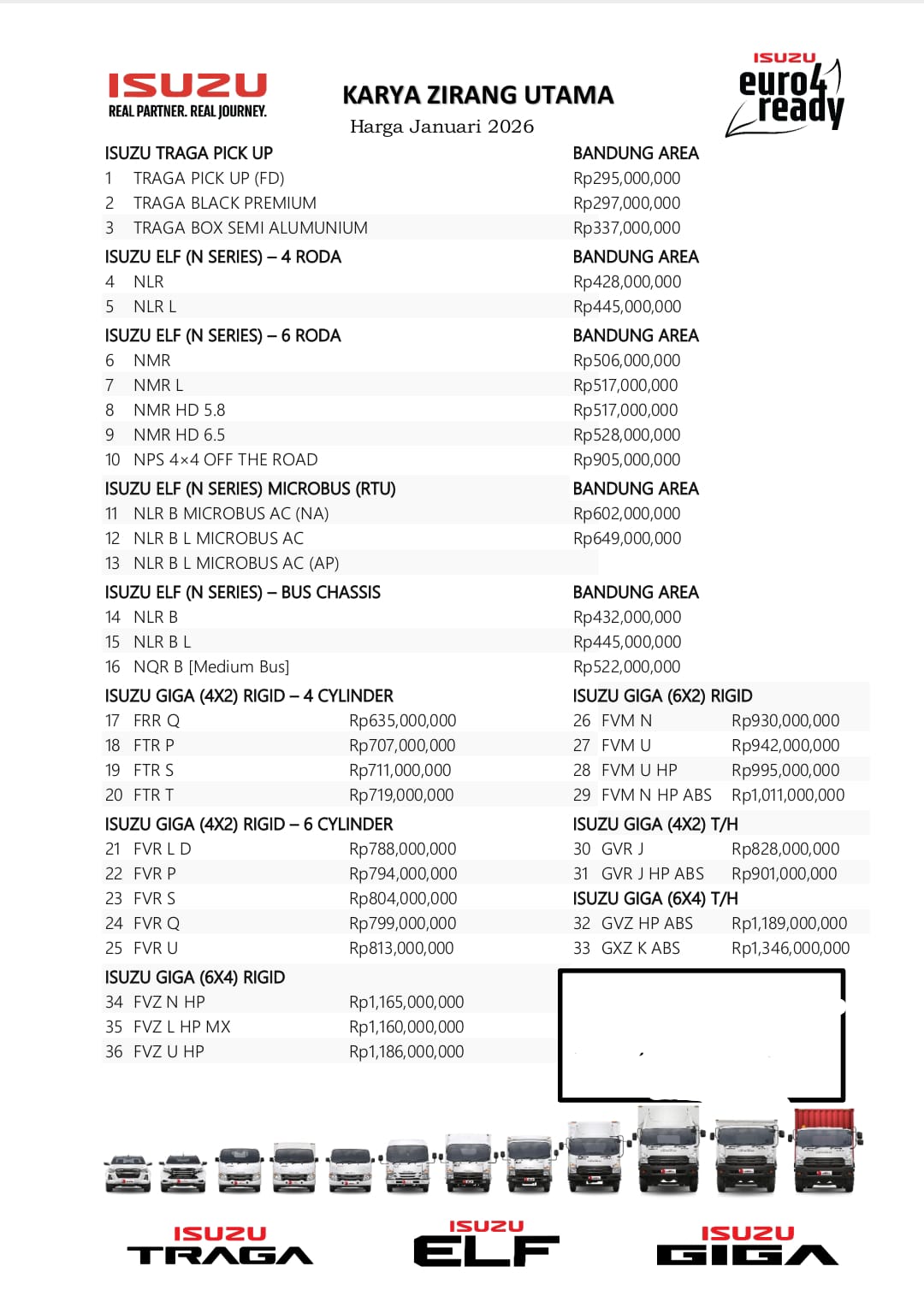 Halo, warga Bandung dan sekitarnya! π Kami di Dealer Isuzu Bandung siap membantu Anda memiliki mobil Isuzu terbaru dengan harga terbaik, promo menarik, dan kredit ringan. Tersedia berbagai pilihan model seperti Isuzu MUX, Isuzu D-Max, Isuzu Traga, Isuzu ELF, Isuzu Giga, dan tipe Isuzu lainnya yang cocok untuk kebutuhan bisnis maupun pribadi.